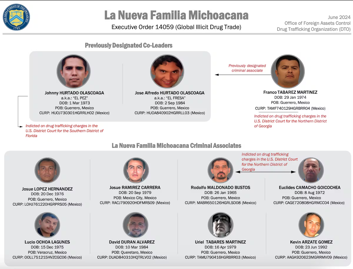 El Departamento del Tesoro también identifica a La Familia Michoacana, a la que denomina en su comunicado La Nueva Familia Michoacana, como responsables de tráfico de seres humanos, migrantes irregulares, hacia Estados Unidos, y los acusa de utilizar violencia “contra sus rivales y las fuerzas de seguridad mexicanas” o del uso de “drones y bombas además de armas de fuego convencionales” con “total desprecio por la población civil de México. También aterrorizan a las comunidades locales mediante secuestros, asesinatos y extorsiones”, señala el comunicado.