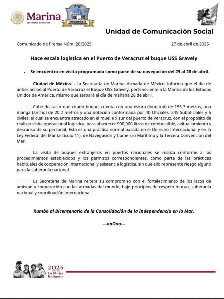 La Secretaría de Marina–Armada de México, informa que el día de antier arribó al Puerto de Veracruz el Buque USS Gravely, perteneciente a la Marina de los Estados Unidos de América, mismo que zarpará el día de mañana 28 de abril.