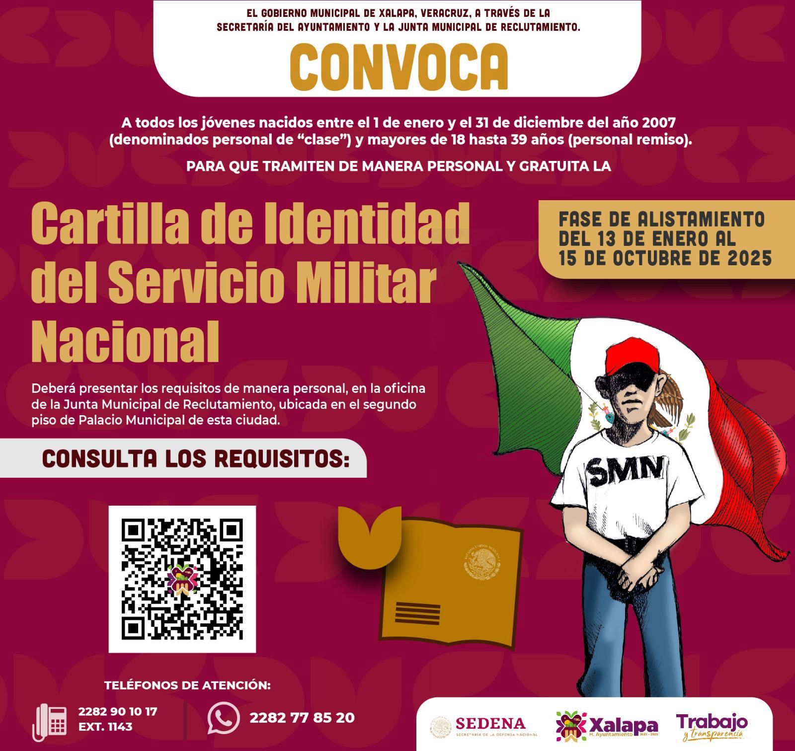 Xalapa, Ver.- El Ayuntamiento de Xalapa, a través de la Regiduría Décima Tercera, la Secretaría y la Junta Municipal de Reclutamiento, hace un llamado a los jóvenes de la Clase 2007 y remisos a realizar el trámite para obtener la Cartilla de Identidad del Servicio Militar Nacional, un documento fundamental para acreditar su registro en el Servicio Militar Nacional.