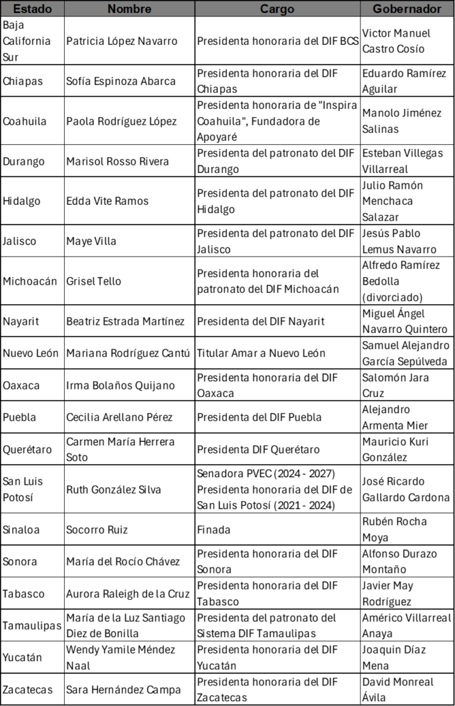 El contexto no ayuda. En 18 de los 19 estados gobernados por hombres, sus esposas ya ocupan cargos públicos, la mayoría como presidentas honorarias del DIF o de organismos sociales creados a modo. La práctica, heredada desde 1977, se mantiene viva pese a los intentos de modernización institucional.