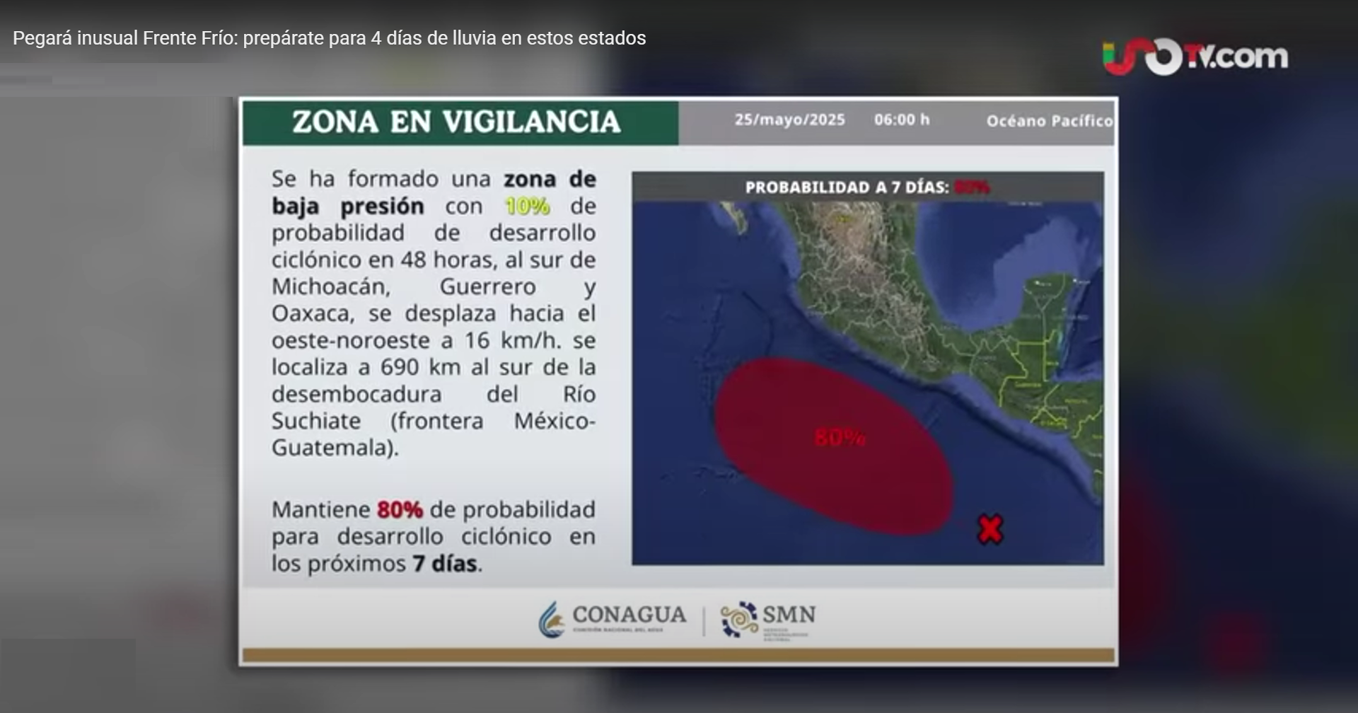 En un segundo plano, se vigila también una zona de baja presión con potencial ciclónico, localizada al sur de Michoacán, Guerrero y Oaxaca. Aunque actualmente tiene solo un 10% de probabilidad de desarrollo en las próximas 48 horas, la Comisión Nacional del Agua (Conagua) estima que su potencial podría aumentar hasta 80% en los próximos siete días.