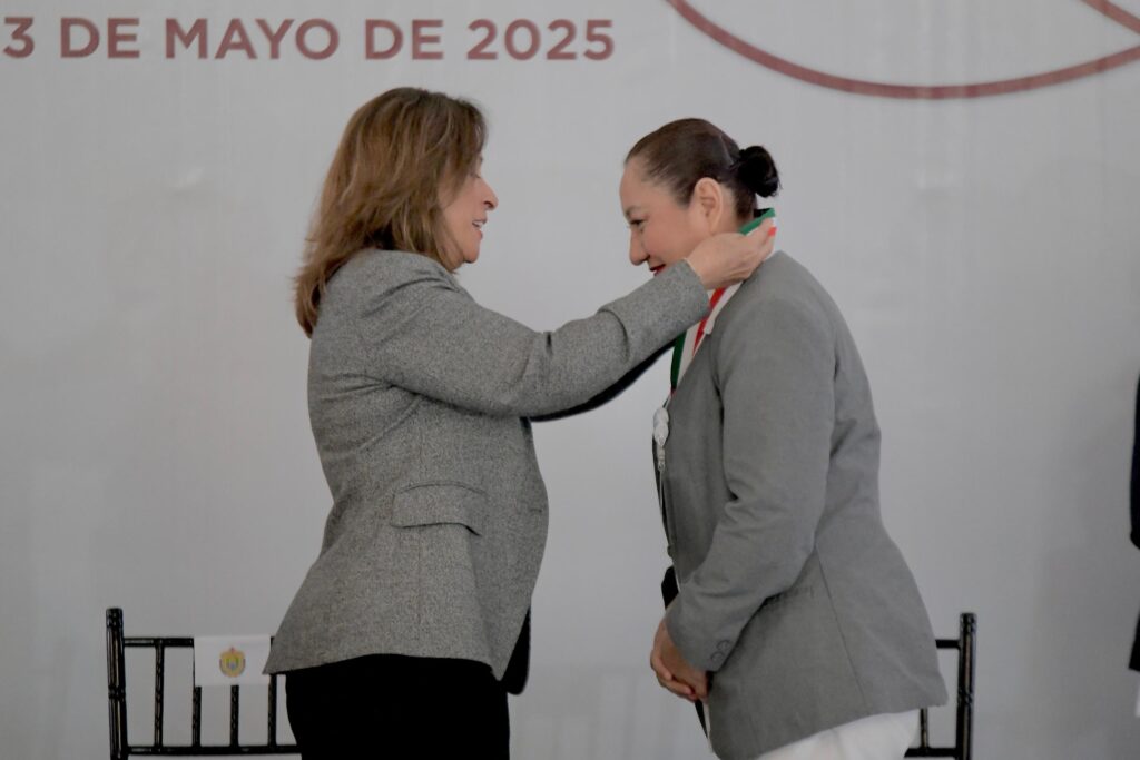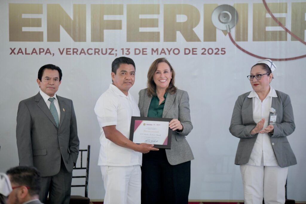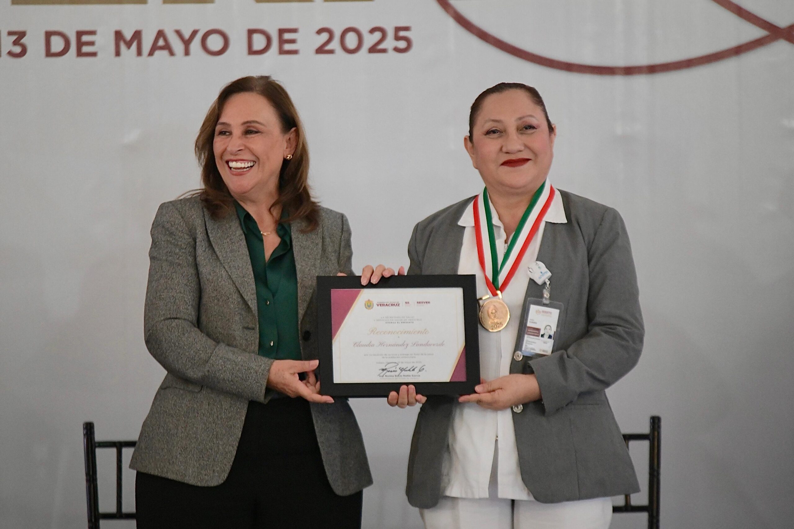 Durante la ceremonia, la titular del Ejecutivo, Rocío Nahle García, entregó seis distinciones por trayectoria y compromiso, así como la Medalla al Mérito y Condecoración Enfermera y Partera Teresa Rodríguez Alonso 2025 a Claudia Hernández Landaverde por su destacada labor en el Hospital del ISSSTE en Poza Rica.